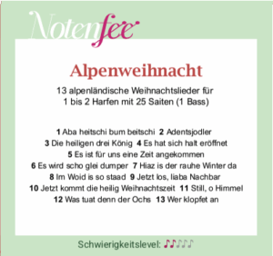Immer wieder gab es Nachfragen, ob die beliebte Mappe „Bergweihnacht“ nicht auch mit Bassstimmen und für Soloharfe erhältlich sei und diesen Wünschen wollte ich nun endlich nachkommen. Mit der „Alpenweihnacht“ erscheint eine ganz neue Sammlung mit teils schon bekannten, teils neuen alpenländischen Weihnachtsliedern aus Bayern, Österreich und auch der Schweiz